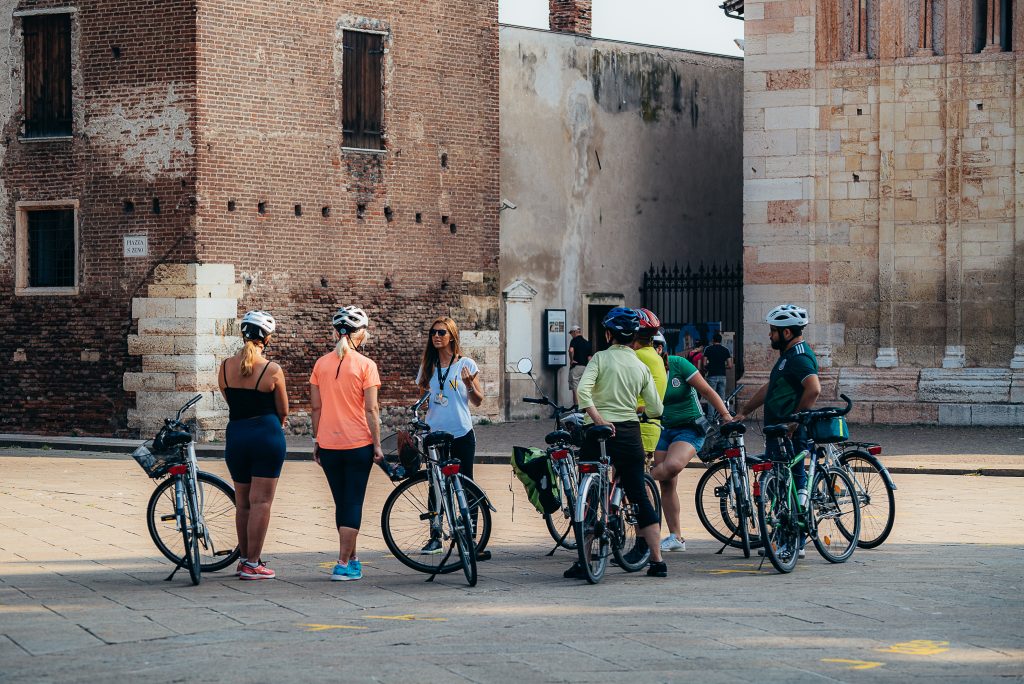 Monta in sella e segui la tua guida per le strade e le piazze principali di Verona. Durante questo tour scoprirai la città vivendola come molti veronesi: osservandola mentre andrai in bici, meravigliandoti della storia e respirando i tanti profumi che si diffondono per le vie del centro. La guida ti accompagnerà a scoprire i monumenti e i luoghi storici, raccontandoti la loro storia e aneddoti interessanti. Insieme agli edifici simbolo della città, scoprirai come erano le strade di un tempo, chi era e come viveva la famiglia che ha guidato Verona al suo splendore. Ti fermerai davanti all’Arena, al balcone di Giulietta, potrai riposarti un momento mentre la guida ti racconta dei magnifici edifici affrescati in Piazza delle Erbe e arriverai fino alla Chiesa di San Zeno, una delle più importanti sia come simbolo religioso della città, che per bellezza architettonica.