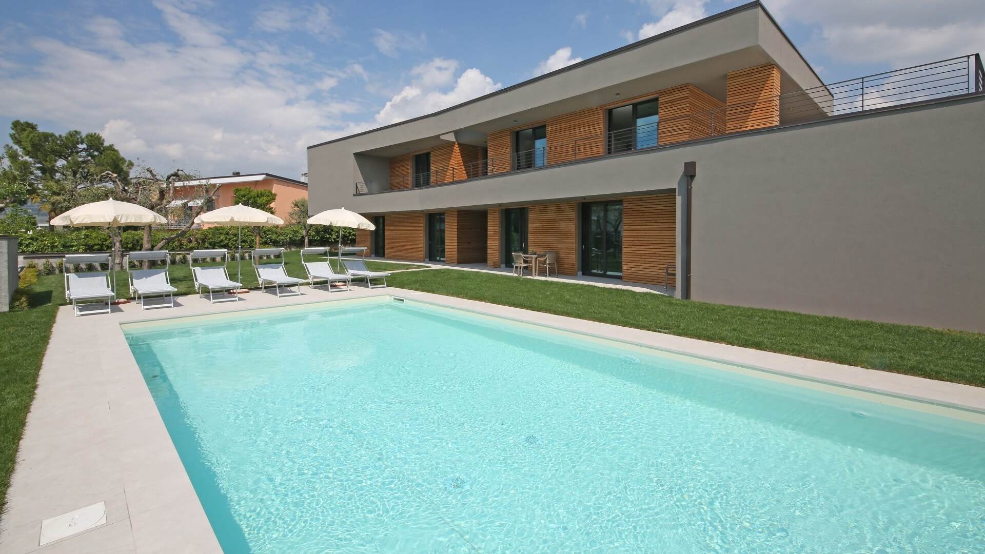All’esterno, il giardino con piscina e lettini invita a rallentare i ritmi e a godersi la dolce atmosfera del Garda.