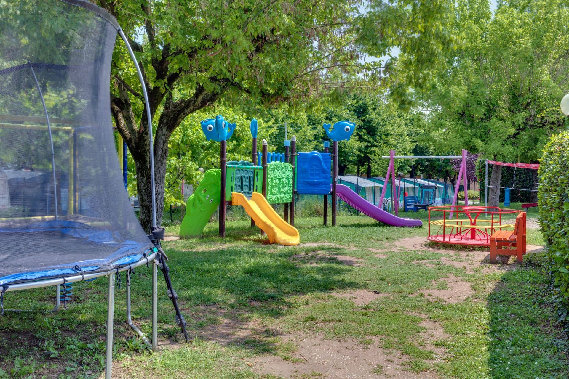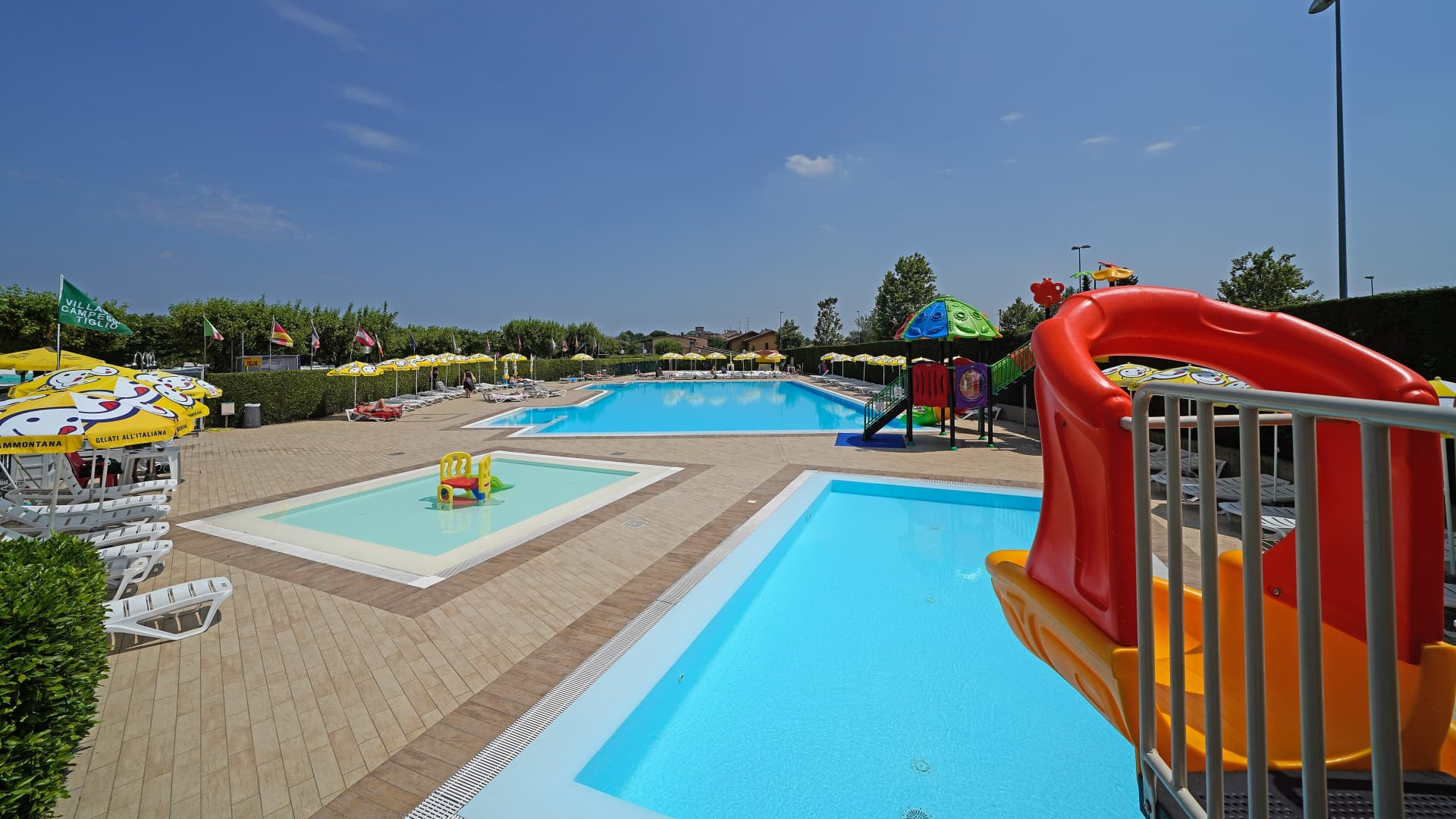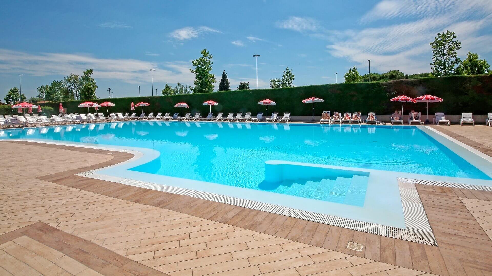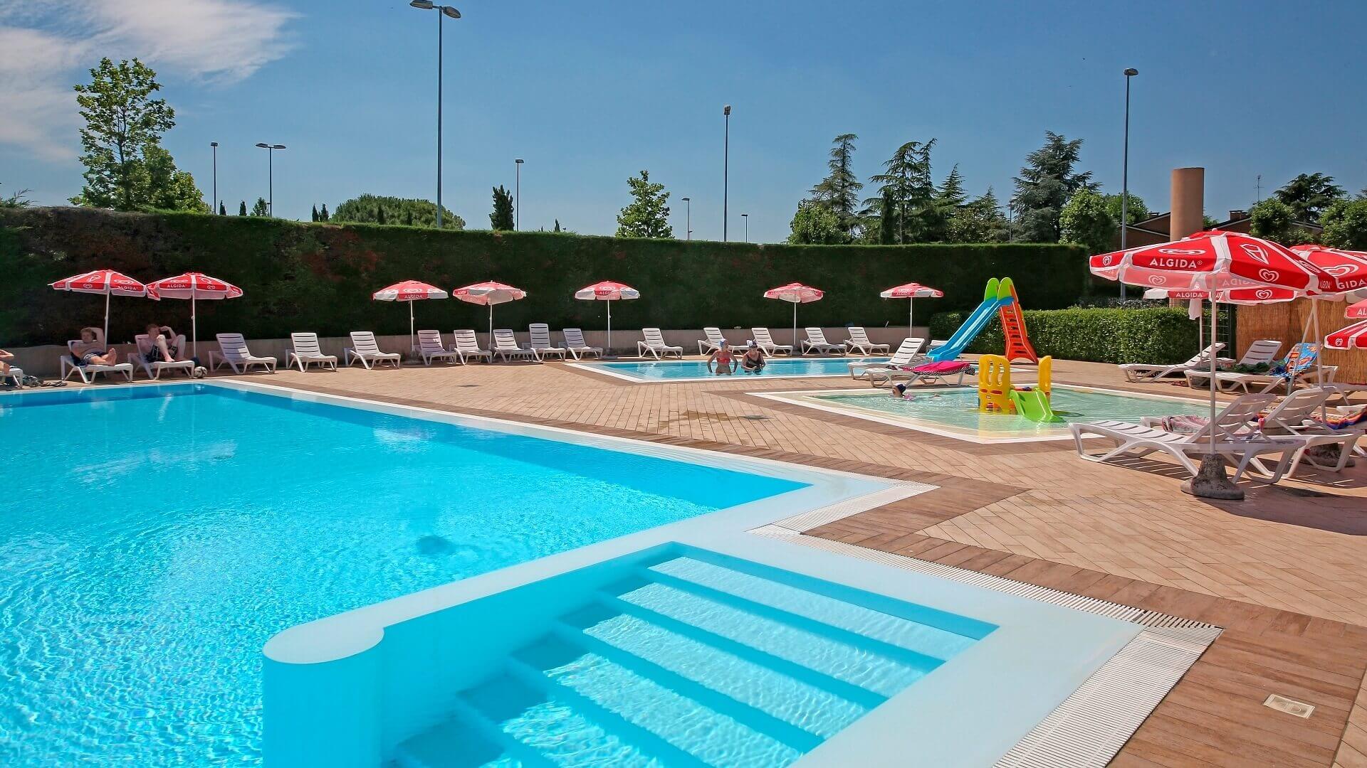 Nel cuore del complesso si trovano tutti i servizi principali: ampia piscina con area dedicata ai bambini, parco giochi, minimarket, bar e ristorante. Un piccolo pontile regala una vista privilegiata sul lago, ideale per un momento di pace, dove il tramonto diventa un appuntamento da vivere fino all’ultimo riflesso sull’acqua.